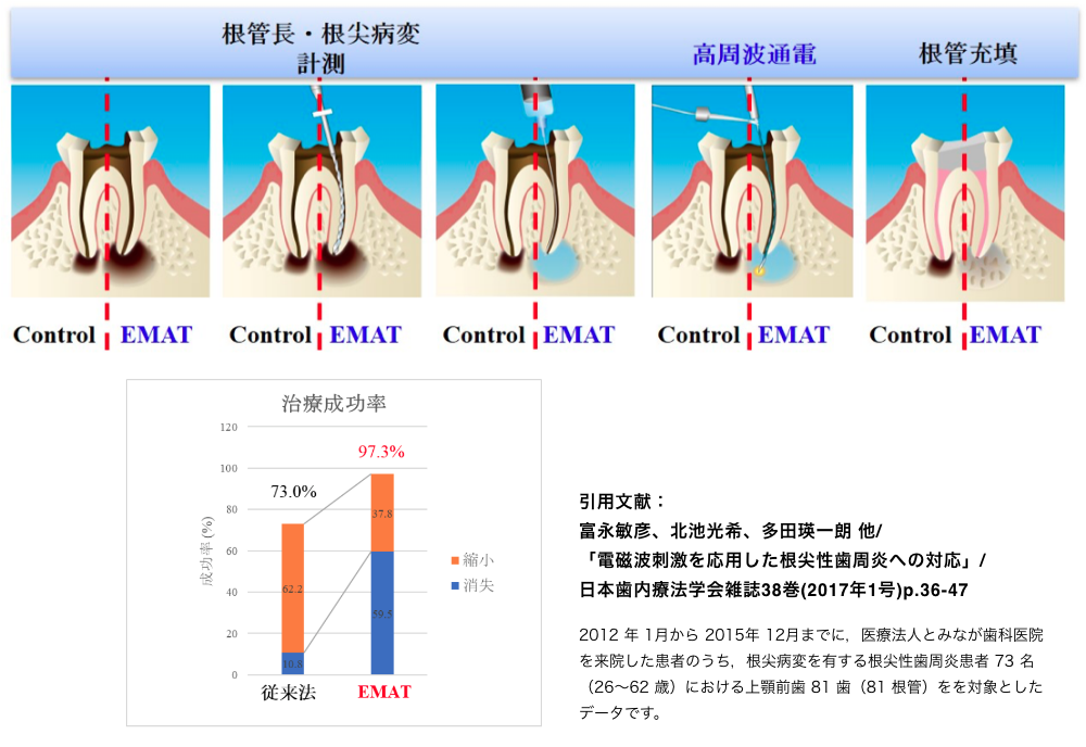 このような従来法では対処することができなかった感染源に対して、電気エネルギーを応用して殺菌を図る新規治療法「高周波歯内療法EMAT(Electro-Magnetic Apical Treatment)」を、2006年に当院にて考案しました。